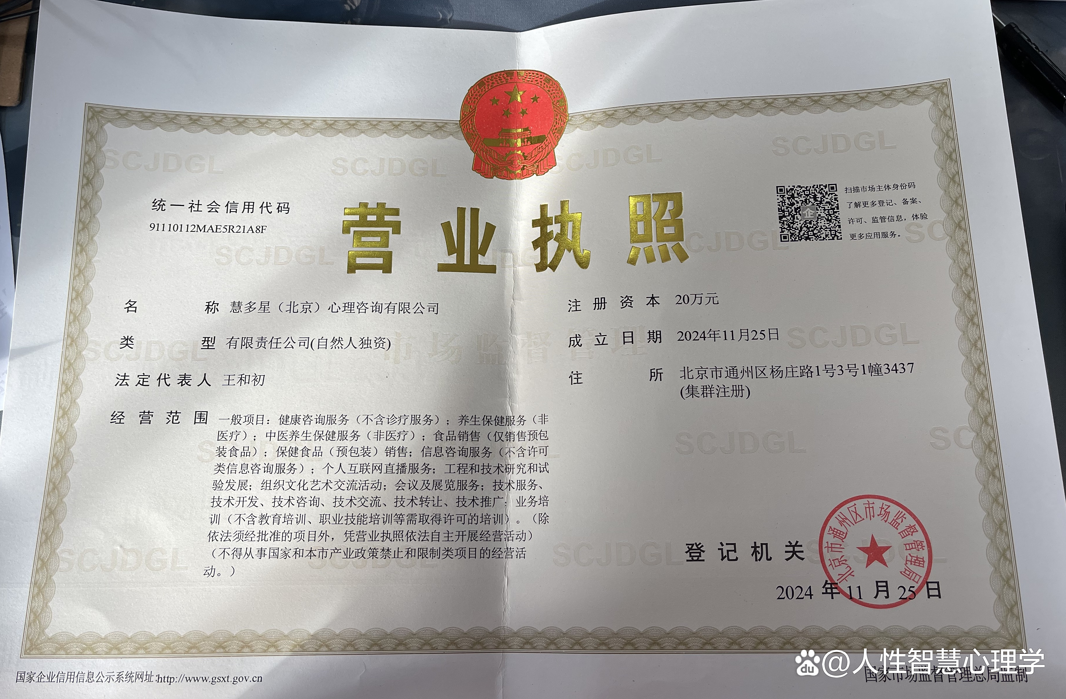 为推广人性智慧心理学 已成立慧多星(北京)心理咨询有限公司鉴于本人在心理咨询实践中,在结合中国文化心理学的基础上,一直致力于心理学的中国化的探索,开创的人性智慧心理学,已经产生了非常好的效果。 在128例案例中,3次以上咨询的抑郁症好转率达到了 95.0%,完全康复率达到了60.0%,复学率达到94%。且在抑郁症,焦虑症患者中,无一例复发。 所以,本人正在撰写《心理学的“顿悟”--人性智慧心理学,能让你霍然而愈》一书。并且,为了更好地推广人性智慧心理学,我已经在北京注册成立了“慧多星(北京)心理咨询有限公司”,业务重心将会移到北京。 人性智慧心理学,用效果说话。 人性智慧心理学,心理学中的“顿悟”派。 特此公告,也感谢一路以来支持我的各界朋友们。 |