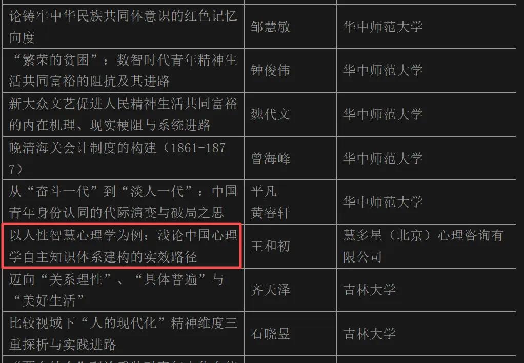 首届“文化、文明与中国式现代化”征文赛解读:关注自主知识体系近日,首届“文化、文明与中国式现代化”征文比赛入围获奖名单正式公示。从名单来看,入围作者绝大多数来自国内知名高校、党校及科研机构,这充分反映了中国学术界对构建中国特色哲学社会科学自主知识体系的高度热情与深度参与。 赛事组委会共收到316家单位共438份投稿作品。经赛事组委会审查、技术查重、专家评审委员会两轮评审,并报研究院理事会审议批准,确定拟入围获奖作品157项。 ![]() 然而,在这批以学术机构为主体的入围者中,一个独特而亮眼的身影格外引人注目——慧多星(北京)心理咨询有限公司。它不是传统意义上的大学或党校,而是一家扎根心理咨询临床实践的一线企业;它的入围论文也不是泛泛而谈的“呼吁建构”,而是基于其开创者王和初先生多年临床实践所创立的中国原创心理学体系——人性智慧心理学,明确提出“用效果构建有用的中国自主知识体系”这一实效导向的建构路径。 这一现象具有双重象征意义: 一方面,它印证了国家推动的“文化、文明与中国式现代化”研究已从学术殿堂延伸到社会各个实践领域; 另一方面,它宣告了中国心理学自主知识体系建设不再停留于理论呼吁或文化符号的堆砌,而是开始生长出源于临床、检验于效果、指向人类共通心理机制的原创性理论成果。 ![]() 以下,结合王和初先生的入围论文《以人性智慧心理学为例:浅论中国心理学自主知识体系建构的实效路径》,对人性智慧心理学的核心内容及其所代表的“实效导向”建构路径进行系统介绍。 一、人性智慧心理学的建构逻辑:从“面子”到“效果” 王和初在论文中尖锐指出,当前中国心理学自主知识体系建构存在三大乱象: “为面子而建”(急于制造与西方对标的概念)、 “堆砌文化符号”(脱离现代科学进展)、 “脱离现实困境”(无法解决国人的真实心理痛苦)。 这些乱象背后的根本问题在于:建构者究竟是“为标签”还是“为效果”? 人性智慧心理学的回答是明确的: 从问题出发,而非从理论出发; 以效果说话,而非用标签说话。 其建构起点不是“我们需要一套对标西方的本土理论”,而是“中国人正面临西方心理学解决不了的心理痛苦,我们如何帮他解决”。论文中列举了李兰香的案例:她在西方心理学取向的咨询师那里做了100多次咨询,花费近5万元,问题依旧;而人性智慧心理学的方法则能有效帮助她走出困境。正是这类临床困境,倒逼出了真正有效的中国原创方法。 人性智慧心理学,不但效果显著,而且提出了众多具有原创性的核心概念,该论文中,就展示了“自我重要感”与“以理化情”的概念内涵和原创的来源。 人性智慧心理学不仅是一套临床技术,更有一套完整的理论基石——“文化塑构认知系统”(王和初,2025)。这一理论回答了“文化究竟如何内化为个体心理、如何影响个体行为”这一根本问题,为心理咨询中运用中国文化资源干预心理困扰提供了可操作的理论路径,也使中国心理学自主知识体系拥有了超越“文化符号装饰”的深层理论支撑。 ![]() 四、亲证研究范式:弥补实证研究的“粗网”之漏 在研究方法上,人性智慧心理学提出了“亲证研究”范式。王和初认为,人心的隐秘性,使得仅靠西方主流的“实证”方法,如同用粗网捞鱼,必然遗漏大量无法量化、不愿言说的微妙的内在体验。而“亲证”——即研究者以自身直接体验为基础,通过内省、觉察、反思获得洞见——能够触及那些实证方法难以捕捉的心理“小鱼”。在亲证提出假设后,再用实证方法加以检验,两者结合才是心理学研究方法的完整之道。这一范式得到了朱建军(2024)的肯定,也为中国心理学自主知识体系的方法论创新提供了新思路。 论文披露了人性智慧心理学在53例抑郁症、焦虑症来访者中的康复数据:好转占比17.0%,康复占比79.2%,好转不明显仅占3.8%,且未发现复发案例。这一效果显著优于秦旻(2010)研究中西方心理学指导下的门诊心理治疗效果(5次会谈仅25%的概率达到临床显著性改变)。论文作者指出:理论的价值,不在于它的“中国味”有多浓,而在于它的“解决能力”有多强。当一套方法能有效解决中国人的心理问题,甚至能为其他文化的人群提供参考,它就不再需要刻意的“本土标签”来证明自己。 从“学术自嗨”到“走向世界” 人性智慧心理学的建构路径,为中国心理学自主知识体系建设提供了一个宝贵的实效导向样板。它证明:中国自主知识体系的最大价值,不在于它“根植于何种文化”,而在于它能否“利用中国文化智慧,服务于民族复兴、有效地解答人类难题”。 当理论源于临床真实痛苦、检验于实际效果、且能指向人类共通心理机制时,它就不再是“本国人的自嗨”,而是有潜力走向世界、贡献人类命运共同体的精神财富。 在首届“文化、文明与中国式现代化”征文比赛中,慧多星公司及其所代表的人性智慧心理学能够从众多高校、党校的学术成果中脱颖而出,本身就是对这一“实效导向”路径的肯定。 它向学术界传递了一个清晰的信号:中国自主知识体系的构建,既需要象牙塔内的理论深耕,更离不开一线实践者的勇敢探索与效果验证。 唯有两者合力,才能真正建设起具有中国特色、中国风格、中国气派,且能为人类文明进步作出实质贡献的自主知识体系